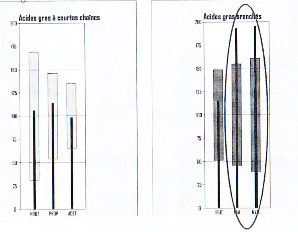 - AG branchés : isovalérate, N-valérate augmentés = mal digestion protéique ?