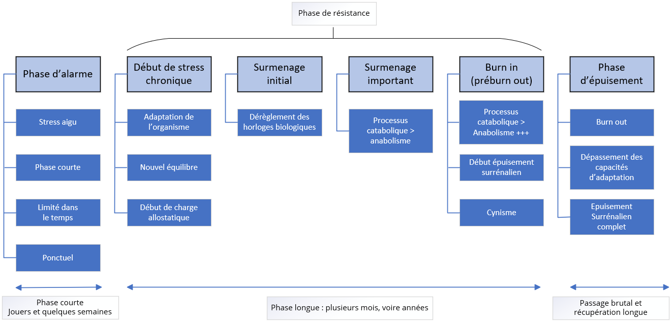 | Phase alarme | Début stress chronique | Surmenage initial | Surmenage important | Burn-in (pré-burn out) | Burn out | |