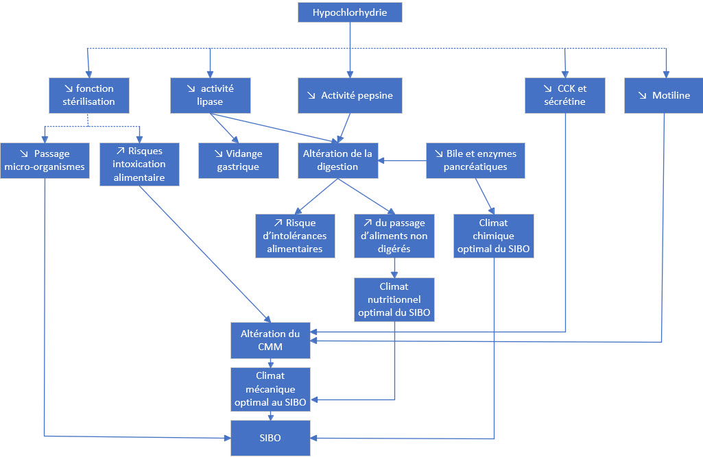 ↓ enzymes gastriques et pancréatiques/bile ➜ maldigestion et stagnation alimentaire ➜ dysbiose (climat nutritionnel/chimique favorable) ➜ SIBO -