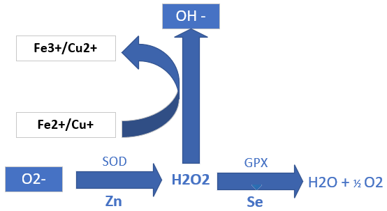 - Réduction de l’H2O2 en OH- par fer ferreux (Fe2+ réduit) ou Cuivre cuivreux (Cu+ réduit)