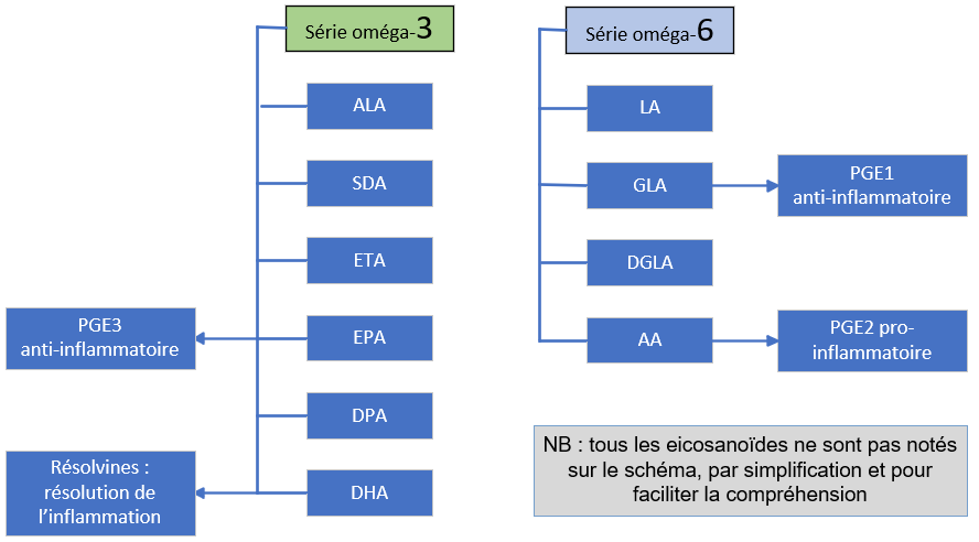 - Production de molécules bioactives : Les acides gras oméga-3 et oméga-6 sont des précurseurs des eicosanoïdes (prostaglandines, leucotriènes, thromboxanes), des molécules impliquées dans la régulation de l’inflammation, de la coagulation sanguine, et de l’immunité.