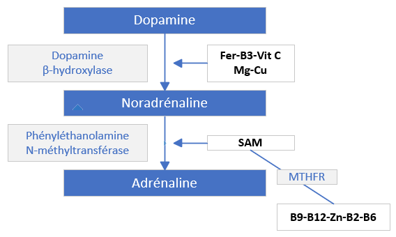 L’adrénaline est synthétisée à partir de la tyrosine, un acide aminé, via une série de réactions enzymatiques. Elle est principalement produite dans la médullosurrénale des glandes surrénales, mais aussi par certains neurones du système nerveux sympathique.