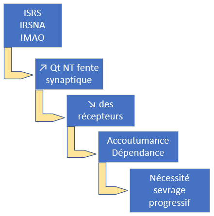 - Inhibiteur des Monoamines oxydase= enzyme de dégradation de la sérotonine et de la Dopamine