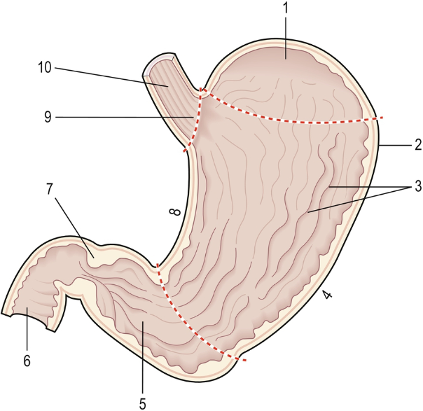 - Parties : Cardia, fundus, corps, antre, pylore.