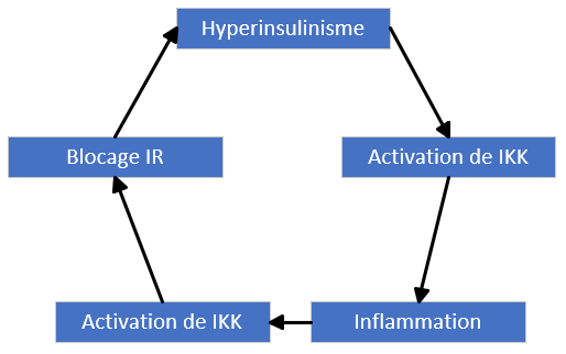 - Inflammation => activation de Kinase IKK => phosphorylation de IRS sur un mauvais site => blocage du IR