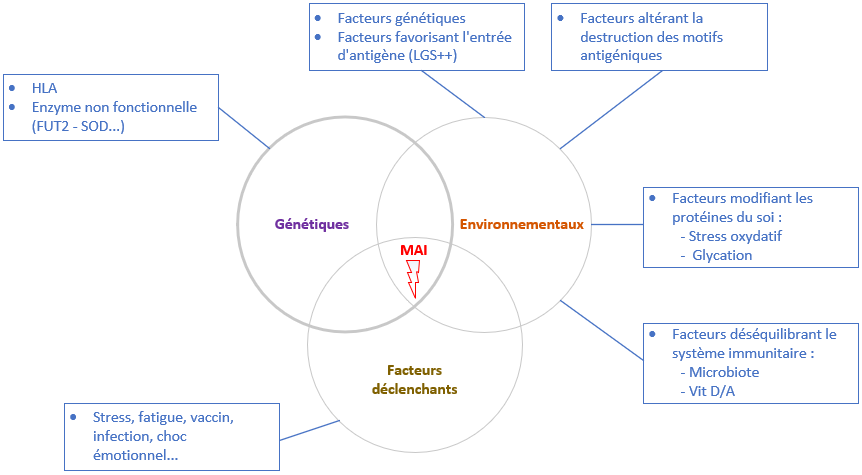 - Des infections virales ou bactériennes, des toxines, des produits chimiques ou des médicaments peuvent déclencher des maladies auto-immunes chez les personnes génétiquement prédisposées. Un phénomène appelé mimétisme moléculaire peut se produire, où des agents pathogènes présentent des similitudes structurelles avec des antigènes du corps, déclenchant ainsi une réponse auto-immune.