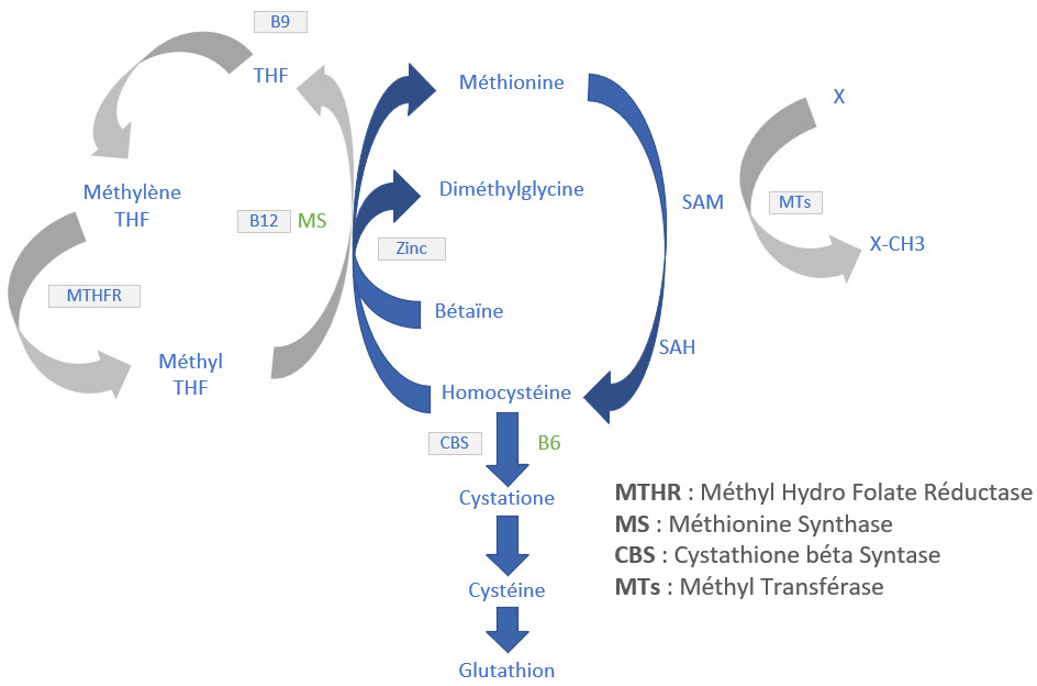 - La méthylation recycle l’homocystéine en méthionine. Une accumulation d’homocystéine en raison d’une méthylation inefficace est un facteur de risque pour les maladies cardiovasculaires et les troubles neurologiques.