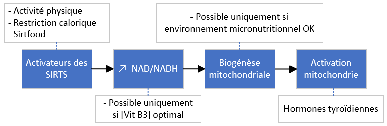 | Synthèse NAD | À partir de B3 (B3= précurseur NAD) NAD(oxydé)/NADH(réduit) → NAD/NADH : Activation des sirtuines → biogenèse mitochondriale |