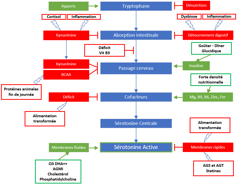 - Le stress chronique, la caféine excessive, et la malnutrition peuvent inhiber la production et la fonction de la sérotonine. Une gestion du stress par des techniques de relaxation, associée à une alimentation équilibrée en nutriments essentiels, aide à soutenir des niveaux sains de sérotonine.